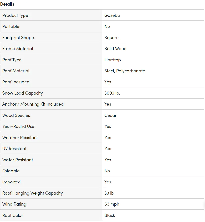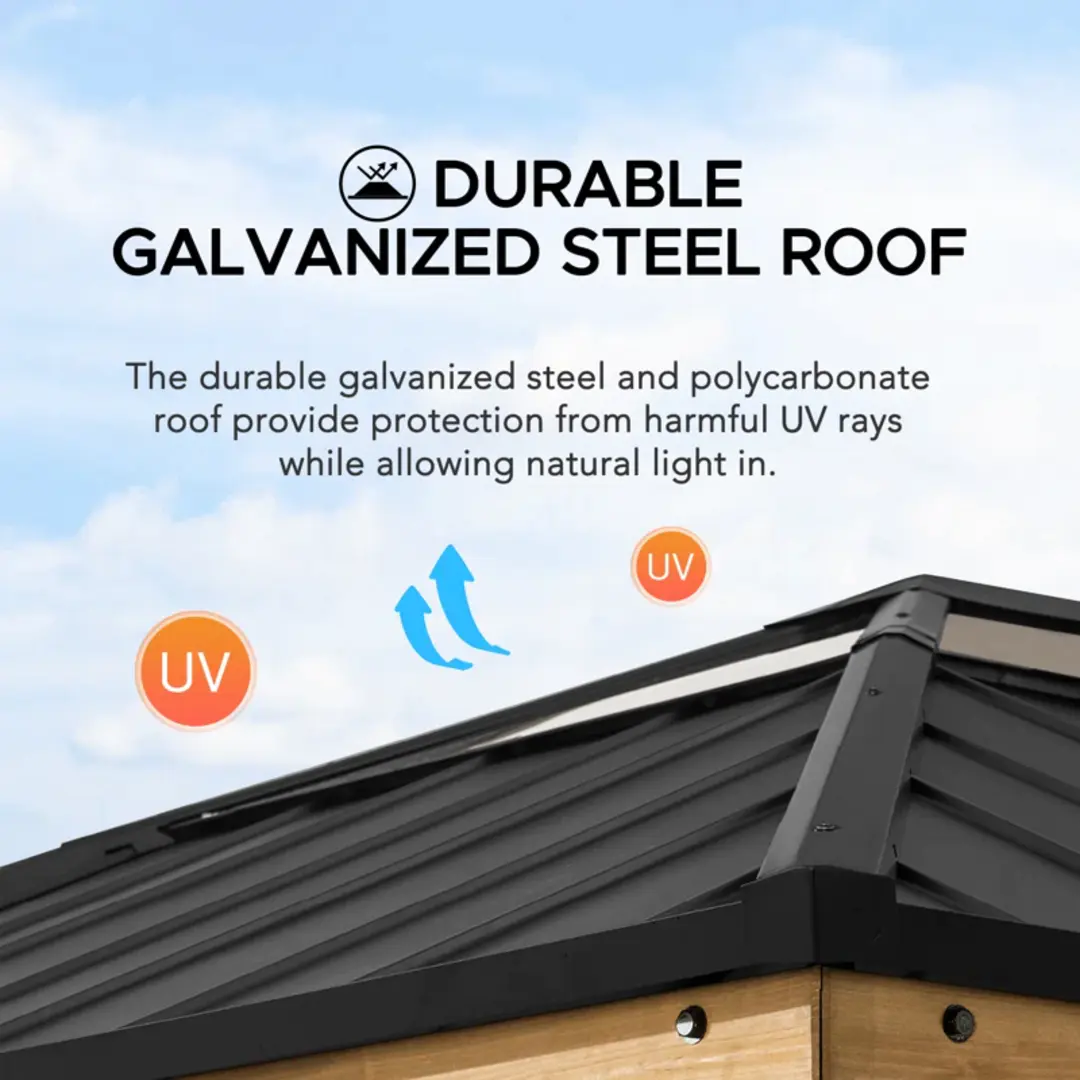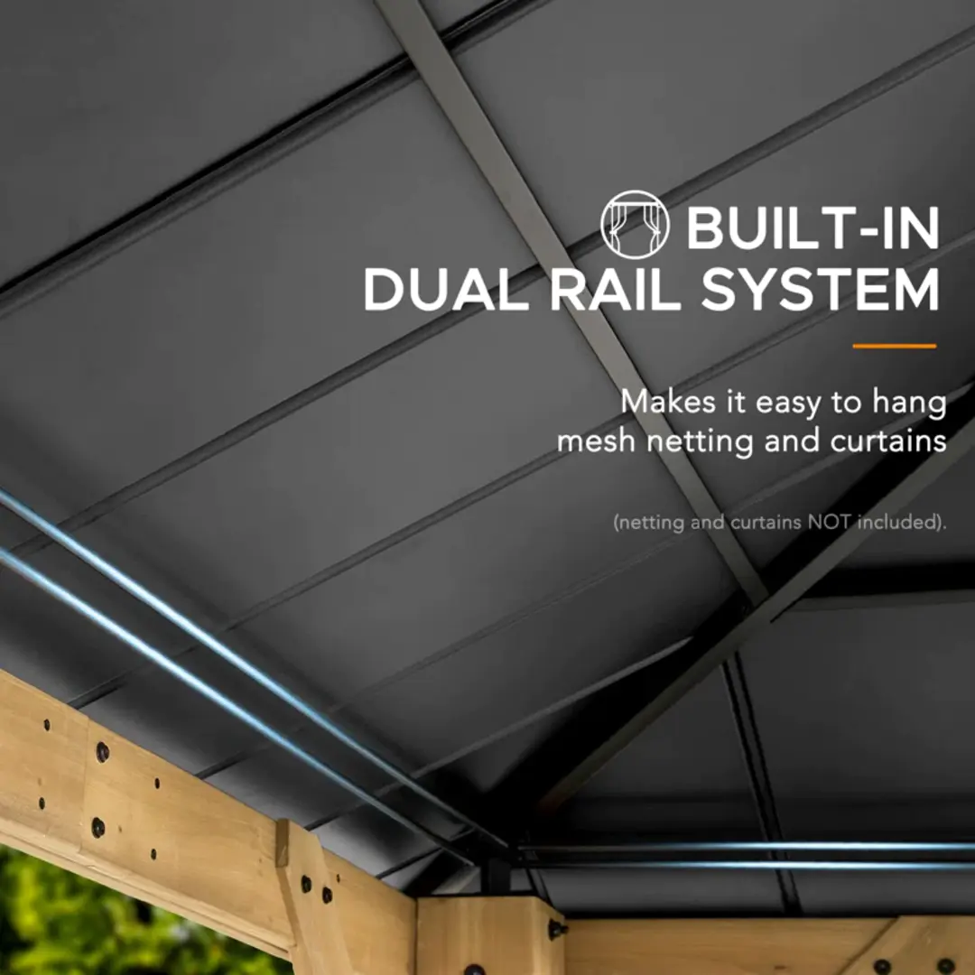 - Stability, Protection & Privacy: The durable matte-black steel and polycarbonate hip roof and premium cedar wood frame combine to provide shade from the heat and keep the water out. Dual rail system included to simultaneously suspend mosquito netting and privacy curtains (mosquito netting and curtains sold separately).