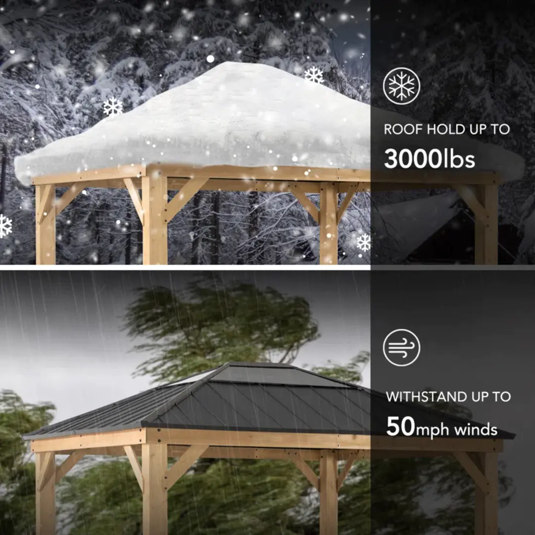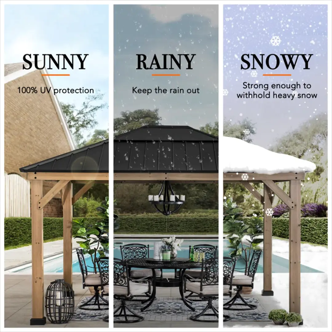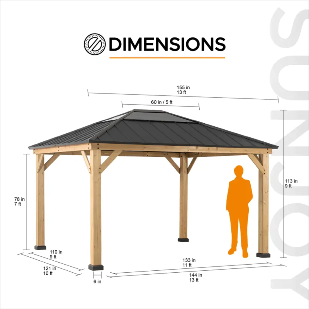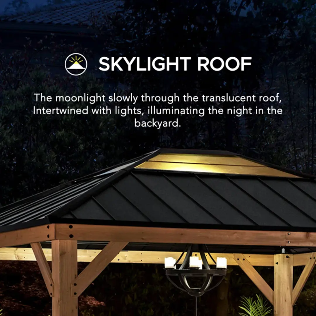 Expand your living space by bringing the indoors outside and creating your end-of-the-day oasis that’s the perfect spot for entertaining family and friends. Sunjoy creates the perfect outdoor setting for any time of the year. Spend all four seasons enjoying a covered spot outdoors beneath a cedar wood frame and sturdy, rust-resistant, powder-coated steel and polycarbonate rooftop that will stand the test of time. The polycarbonate skylight allows the gazebo to provide needed shade on hot sunny days while still allowing in natural light. Set the mood by suspending a chandelier from the incorporated ceiling hook for additional functional light and a touch of elegance. With straightforward, easy-to-follow assembly instructions you’ll soon be enjoying your favorite new outdoor living space, and for years to come.